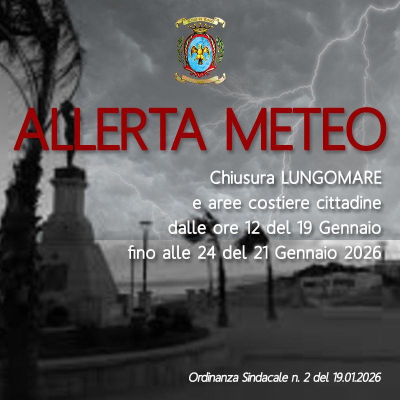 - la chiusura del Lungomare e delle aree costiere cittadine (fino alle ore 24 del 21 gennaio 2026);