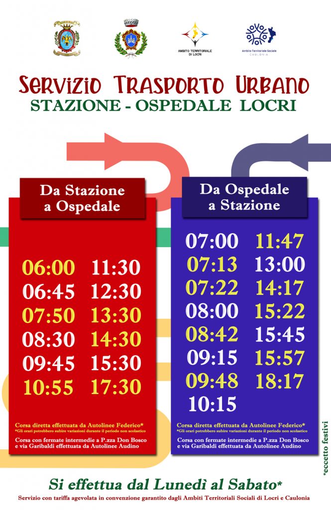L’Ambito Territoriale di Locri insieme alla fattiva collaborazione dell’ATS di Caulonia, comunica che da lunedì 12 gennaio 2026 prenderà ufficialmente il via il servizio-navetta che collegherà la stazione ferroviaria di Locri all’Ospedale di Locri (e viceversa), con 26 collegamenti quotidiani tra andata e ritorno (prima corsa ore 6:00 ultima 19:22). Capolinea delle partenze sono appunto la Stazione FS di Locri e l’Ospedale di Locri, con fermate intermedie previste anche a Piazza don Bosco e in Via Garibaldi (nei pressi dell’incrocio con la via Cosmano).
